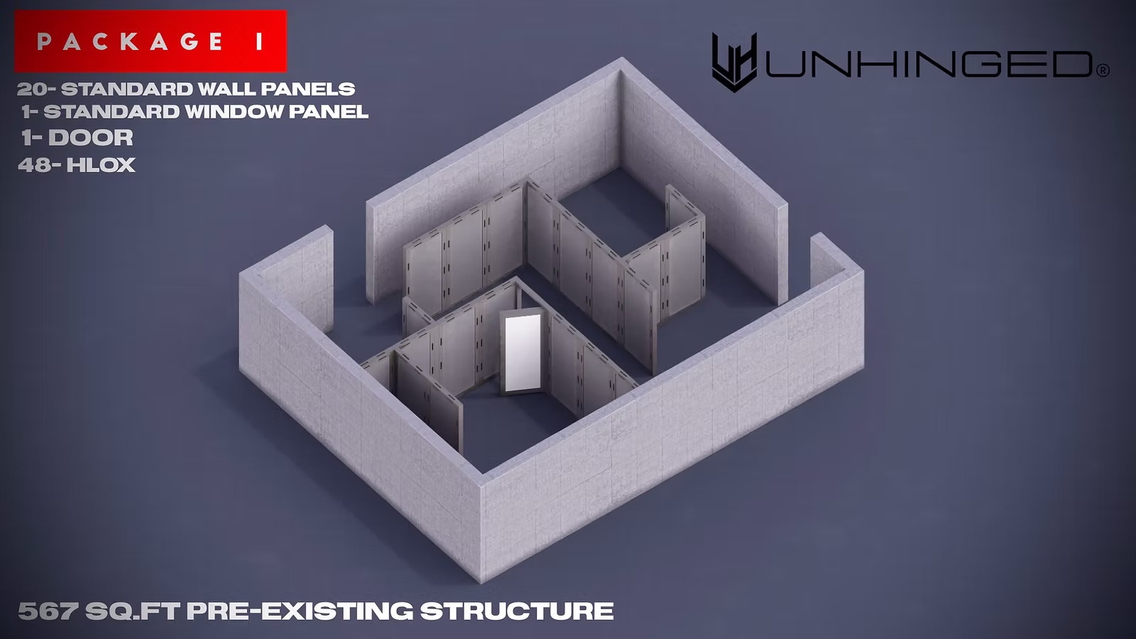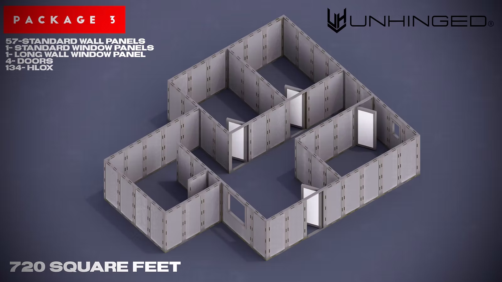 An expanded modular configuration offering increased layout flexibility and interior space. Supports up to 3 rooms and approximately 400-650 square feet. This package allows for more defined room separation and greater variety in layout options, while maintaining the ability to reconfigure and scale as training requirements change.